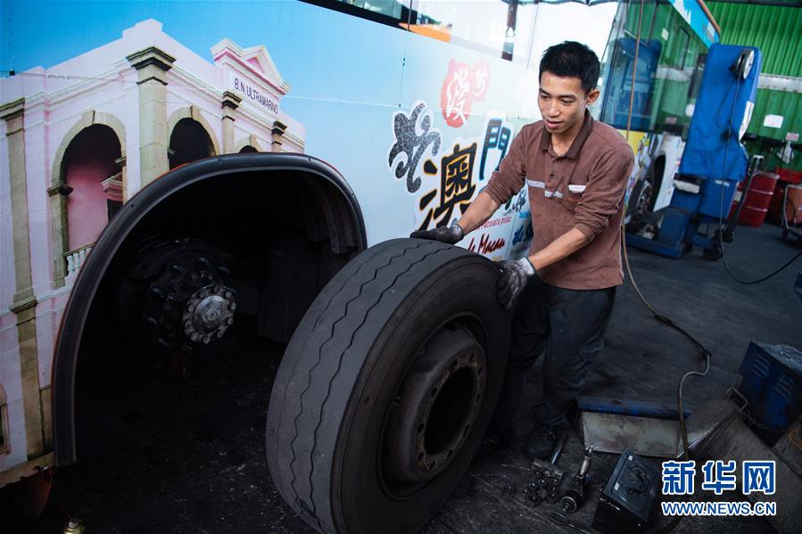 11月26日,澳門公共汽車股份有限公司鄭家松在推輪胎,他已經(jīng)工作了2年,主要負(fù)責(zé)為公交車做定期保養(yǎng)及維修。 新華社記者 張金加 攝