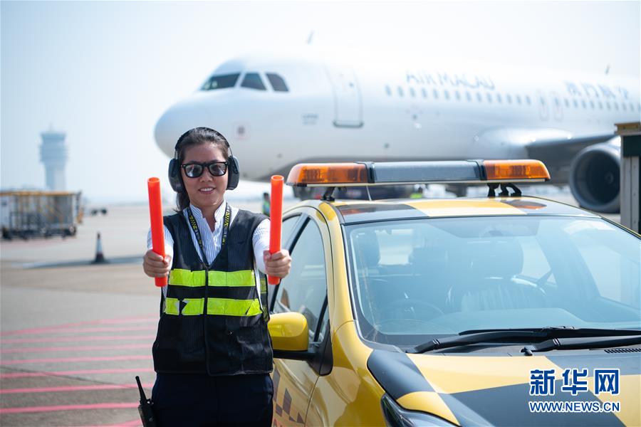 11月25日,澳門國際機場營運員鄧祺君在機場指揮飛機停泊,她已經(jīng)工作了3年。 新華社記者 張金加 攝