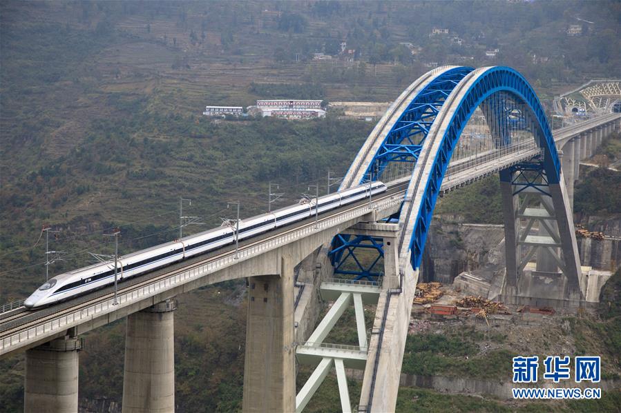 12月2日,一輛試驗列車駛過成貴高鐵鴨池河特大橋。新華社記者劉續(xù)攝