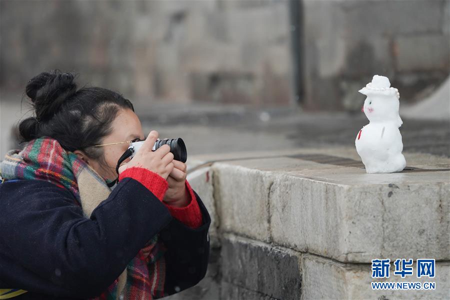 12月16日,在北京天壇公園,一名女士拍攝小雪人。當日,北京迎來降雪天氣。新華社記者鞠煥宗攝