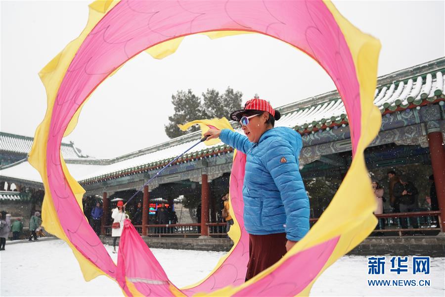 12月16日,在北京天壇公園,一名市民雪中健身。當日,北京迎來降雪天氣。新華社記者鞠煥宗攝