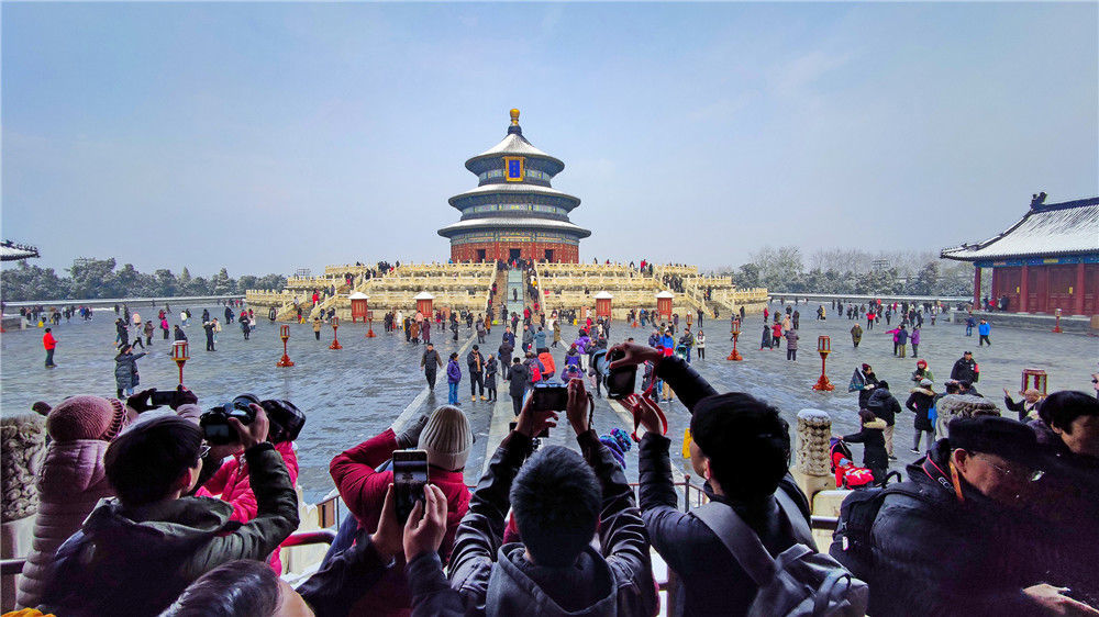 2019年11月30日,北京,天壇公園里觀雪賞景的市民絡繹不絕。喬健/千龍圖像/視覺中國