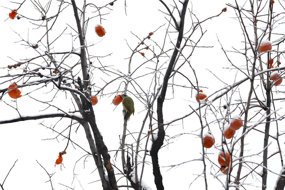 2019年11月30日,雪后的北京天壇公園內,鳥兒在柿子樹上覓食。29日,北京迎來2019年冬季初雪。富田(攝影部)/中新社/視覺中國