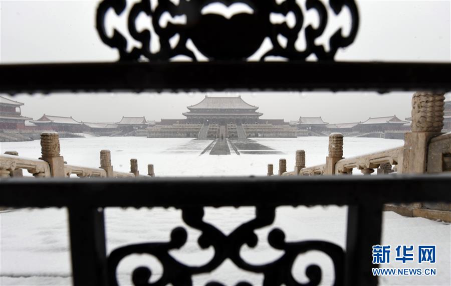 12月16日拍攝的雪中的故宮太和殿廣場。當日,北京迎來降雪天氣。新華社記者金良快攝