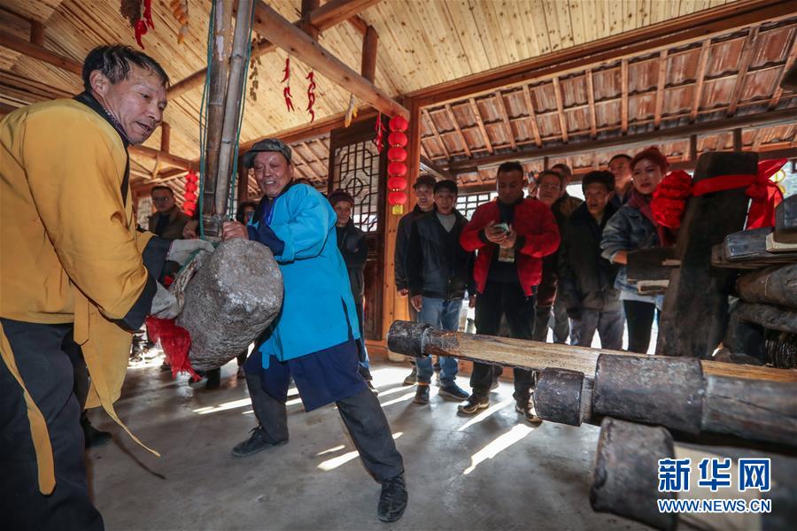 12月15日,工作人員在老油坊內(nèi)通過撞擊的方式將不同尺寸的木楔插入木龍,進而榨出茶餅中的茶油。 新華社記者 徐昱 攝