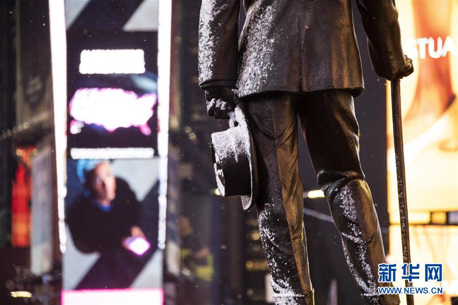12月18日,美國紐約時報廣場上的雕像落上積雪。新華社記者 王迎 攝