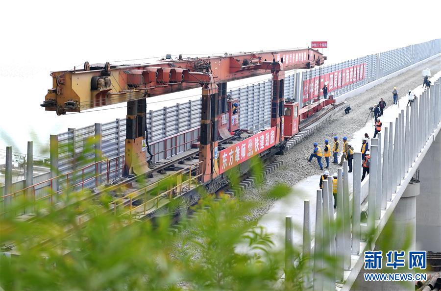 12月22日,中鐵二十四局工作人員在平潭海峽公鐵大橋鋪軌施工現(xiàn)場進行鋪軌作業(yè)。新華社記者林善傳攝