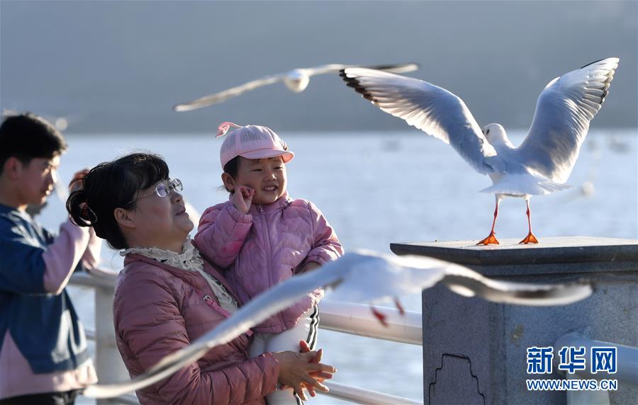 12月18日,人們?cè)诶ッ骱9〈髩斡^賞、投喂紅嘴鷗。 近日,“春城”昆明陽(yáng)光明媚,氣候宜人,市民游客紛紛來(lái)到海埂大壩、翠湖公園等地,與前來(lái)越冬的紅嘴鷗近距離接觸,人鷗同樂。紅嘴鷗是云南昆明的“榮譽(yù)市民”,每年秋冬季都會(huì)來(lái)到昆明越冬。 新華社記者 藺以光 攝