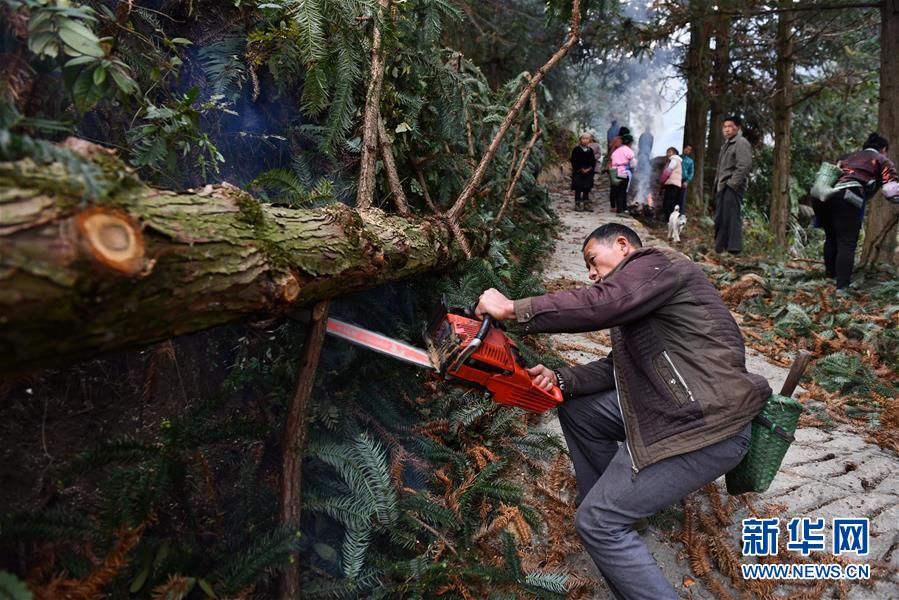烏英苗寨村民在鋸木頭,準(zhǔn)備制作蘆笙柱(12月2日攝)。新華社記者黃孝邦攝