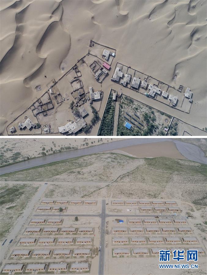 拼版照片:上圖為地處沙漠腹地的新疆于田縣達里雅布依鄉(xiāng)一處村落(2018年9月6日無人機拍攝);下圖為建設(shè)中的達里雅布依小鎮(zhèn)易地扶貧安置點(2018年9月8日無人機拍攝)。新華社記者胡虎虎攝