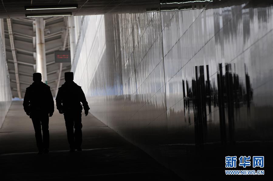金寨火車站派出所民警何津超(左)和王晨旭在站前廣場(chǎng)執(zhí)勤(12月19日攝)。新華社記者張端攝