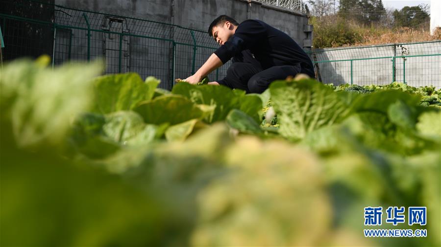 12月18日,常曉龍?jiān)诓藞@摘菜。警務(wù)室位于深山,平時(shí)買菜不方便,常曉龍?jiān)隈v地院子里開墾了一片小菜園。新華社記者劉軍喜攝
