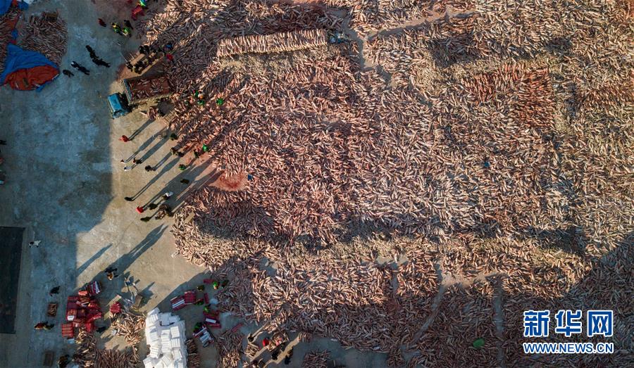 12月27日,在吉林松原查干湖漁場(chǎng),工人們將魚裝箱(無人機(jī)拍攝)。新華社記者張楠攝