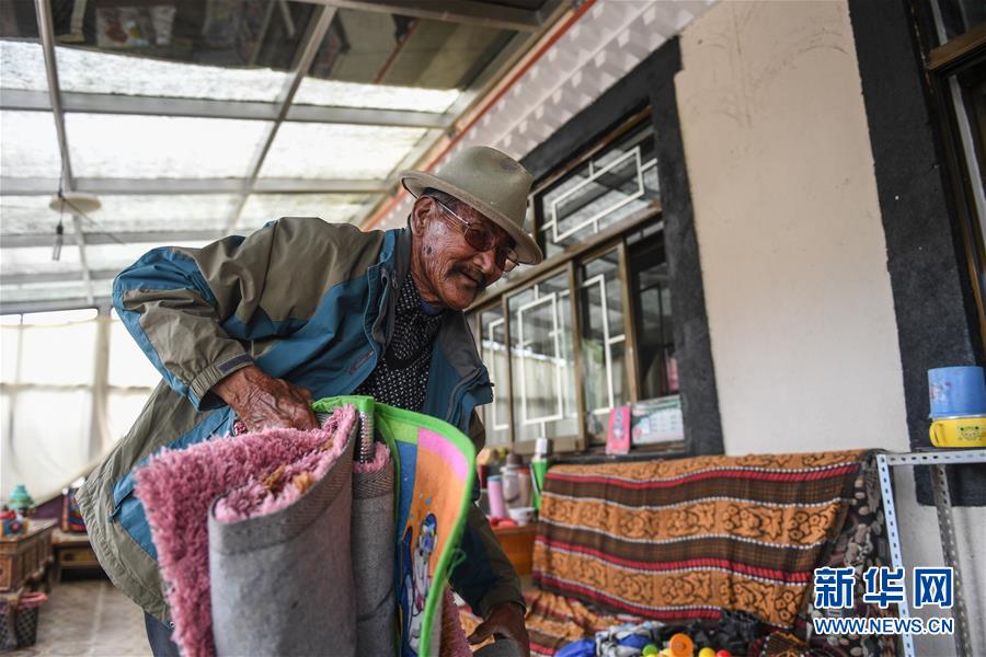 在西藏阿里地區(qū)札達縣托林鎮(zhèn)札布讓村,76歲的達瓦次仁在整理家庭旅館的床墊(7月30日攝)。新華社記者晉美多吉攝