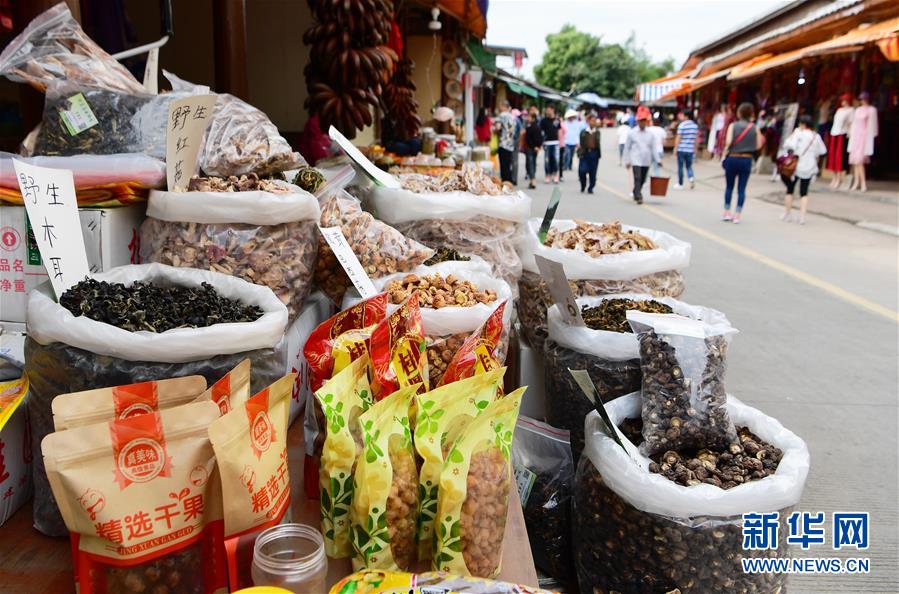 在龍巖市永定區(qū)湖坑鎮(zhèn)高頭鄉(xiāng)高北村的土樓風情一條街,當?shù)卮迕癜炎约荷a(chǎn)的各式農(nóng)產(chǎn)品向參觀游客進行銷售(5月4日攝)。新華社記者魏培全攝
