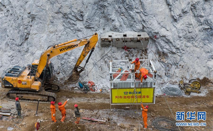 四川路橋的施工隊(duì)伍在對(duì)阿布洛哈村擺渡車進(jìn)行最后的安裝和調(diào)試(2019年12月27日攝)。新華社記者江宏景攝