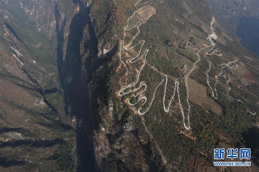 俯瞰布拖縣烏依鄉(xiāng)阿布洛哈村通村公路的起點拉果鄉(xiāng)偉木村。從拉果鄉(xiāng)政府到阿布洛哈村通村公路的起點位置要經(jīng)過54個回頭彎(2019年12月7日攝)。新華社記者江宏景攝