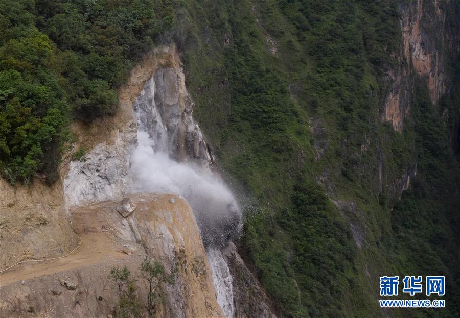 阿布洛哈村通村公路施工中進(jìn)行的一次爆破(2019年7月18日攝)。在該公路修建中遇到陡崖夾溝地勢時,施工人員有時一天要進(jìn)行10余次爆破。新華社記者江宏景攝