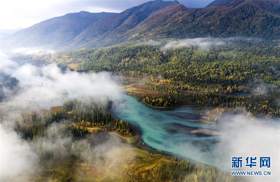 9月24日無(wú)人機(jī)拍攝的喀納斯景區(qū)風(fēng)光。新華社記者王菲攝
