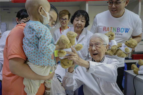2019年5月31日,北京兒童醫(yī)院百歲兒科醫(yī)生張金哲(前右)在北京關愛惡性實體腫瘤患兒公益活動上向住院的孩子贈送兒童節(jié)禮物。新華社記者張玉薇攝