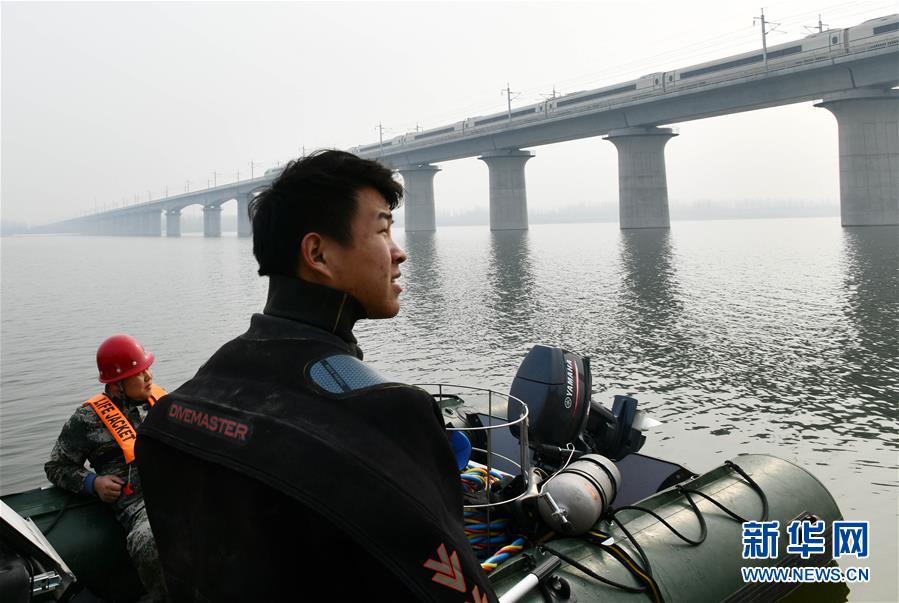 1月3日,潛水員李壯看著飛馳而過(guò)的列車準(zhǔn)備潛水檢查橋墩。新華社記者 朱崢攝