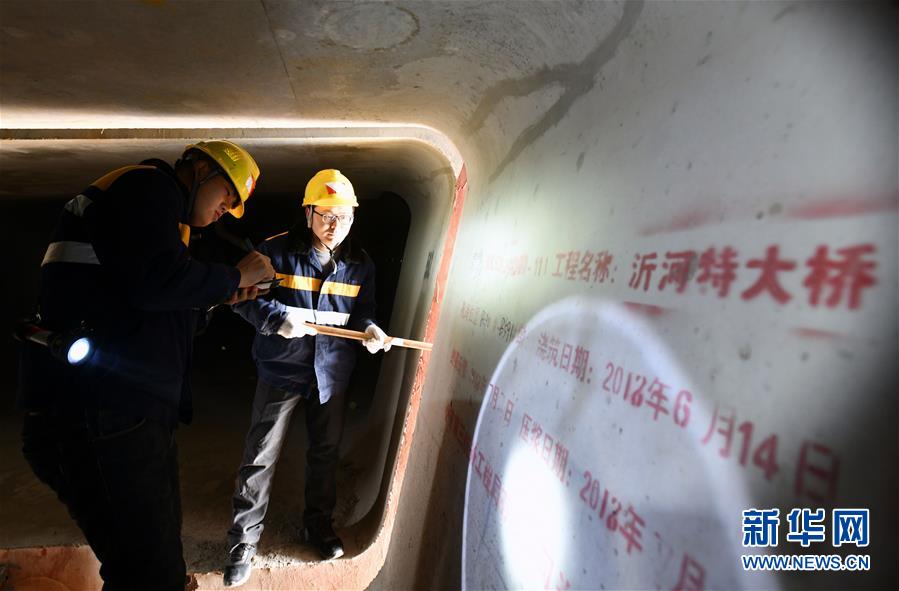 1月3日,中國鐵路濟南局臨沂工務段工程技術員在沂河特大橋箱梁內檢查。新華社記者 朱崢攝