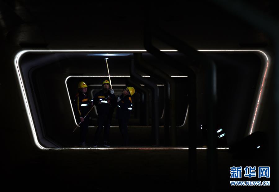 1月3日,中國鐵路濟南局臨沂工務段工程技術員在沂河特大橋箱梁內檢查。新華社記者 朱崢攝