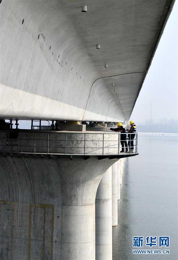 1月3日,中國鐵路濟(jì)南局臨沂工務(wù)段工程技術(shù)員在沂河特大橋橋墩上檢查。新華社記者 朱崢攝