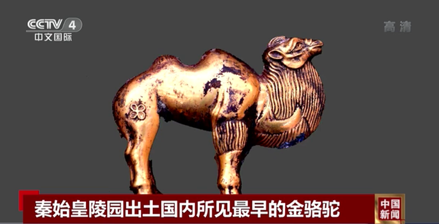 出土的金駱駝是目前國(guó)內(nèi)所見(jiàn)最早的單體金駱駝。這些出土器物不僅為漢代絲綢之路開(kāi)通以前,中西文化交流提供了重要依據(jù),也為秦代政治、經(jīng)濟(jì)、軍事、科技、文化等研究提供了重要的實(shí)物材料。