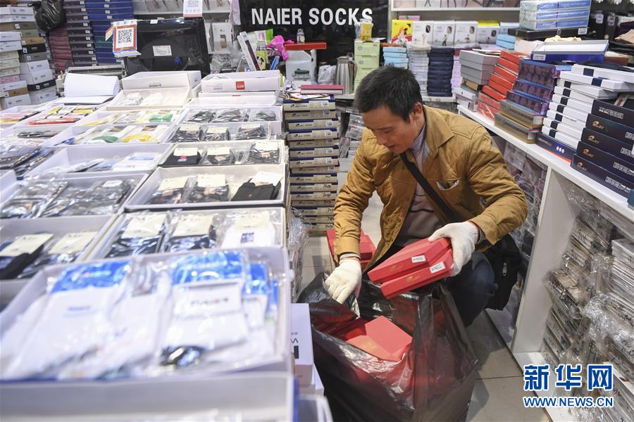 冉光輝在重慶朝天門大正商場(chǎng)內(nèi)整理即將搬運(yùn)的貨物(1月5日攝)。新華社記者王全超攝