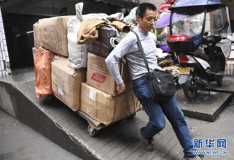 冉光輝用小板車載著貨物,從重慶朝天門大生商場(chǎng)出發(fā),前往發(fā)貨地點(diǎn)(1月5日攝)。新華社記者王全超攝