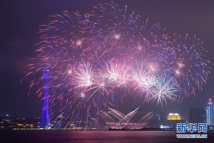 2019年12月31日,澳門特區(qū)在旅游塔對(duì)開(kāi)海面綻放煙花,迎接新一年。 新華社記者 張金加 攝