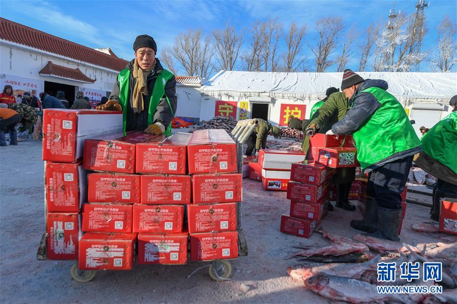 12月27日,在吉林松原查干湖漁場(chǎng),工人們將魚裝箱。新華社記者張楠攝