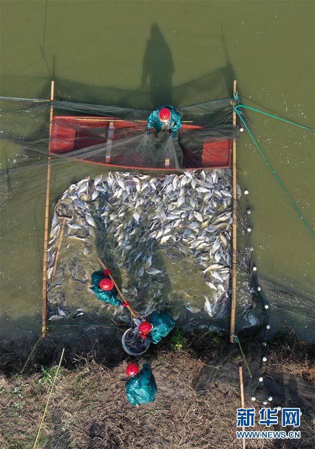 12月28日,漁民們?cè)诹夂?zhèn)盛江家庭農(nóng)場(chǎng)拉網(wǎng)捕魚(yú)(無(wú)人機(jī)拍攝)。新華社記者黃宗治攝
