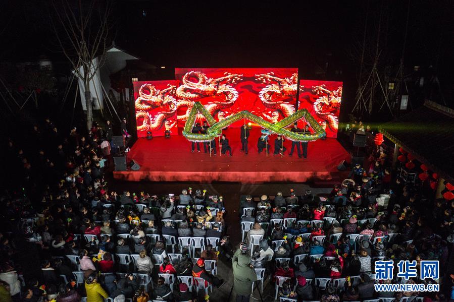 1月14日,杭州市余杭區(qū)中泰街道中橋村的文化公園內(nèi)在進行“我們的村晚”舞龍表演,吸引了大批當?shù)匕傩沼^看(無人機照片)。臨近春節(jié),浙江省杭州市余杭區(qū)中泰街道各村社的文化禮堂紛紛上演“我們的村晚”。老百姓自編、自導、自演為主的“土味”聯(lián)歡會因接地氣、親情濃而深受當?shù)匕傩盏南矏郏蔀楫數(shù)剜l(xiāng)村百姓的新年迎春“文化大餐”。近年來,中泰街道以文化振興助推鄉(xiāng)村振興。目前,中泰街道下屬各村陸續(xù)建成文化禮堂7個、社區(qū)文化家園2個,努力培育和挖掘出一批鄉(xiāng)土文化人才及原創(chuàng)作品,2019年全年開展各類鄉(xiāng)村社區(qū)惠民文體活動累計180余場次。新華社記者徐昱攝