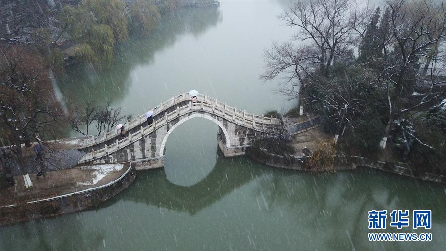 1月15日,幾名游客在雪中的合肥市包公園參觀(無(wú)人機(jī)照片)。 當(dāng)日,安徽省合肥市迎來(lái)降雪天氣。雪中的合肥市包公園景色別致。 新華社記者 張端 攝