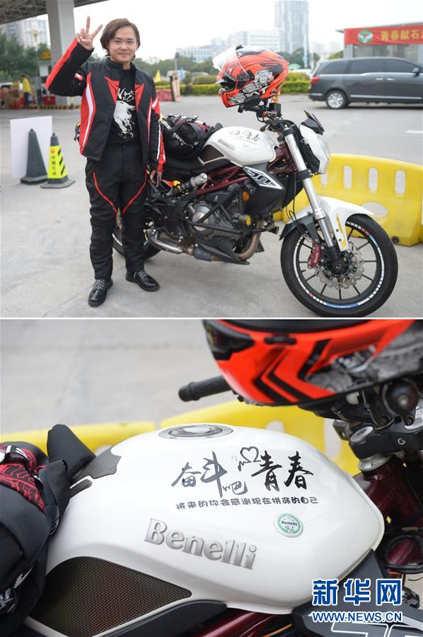 拼版照片:上圖是冉曉紅在中國(guó)石油漳州龍江路站留影,下圖是冉曉紅摩托車上的標(biāo)語(1月15日攝)。20歲的冉曉紅是重慶人,在福建廈門從事餐飲業(yè),2019年買了一輛高檔摩托車,2020年與朋友結(jié)伴騎摩托車返鄉(xiāng),路上預(yù)計(jì)需要五天時(shí)間。 新華社記者 賀燦鈴 攝