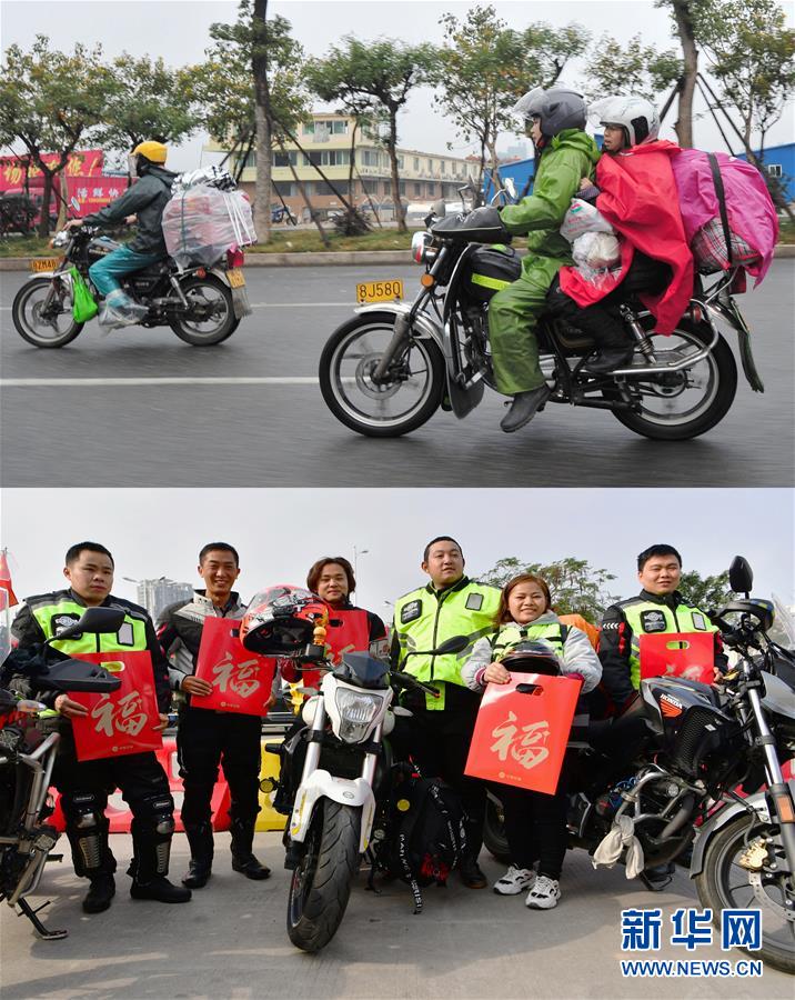 拼版照片:上圖是江西、安徽和湖北籍農(nóng)民工組成的返鄉(xiāng)“鐵騎大軍”騎行在返鄉(xiāng)路上(2014年1月23日攝);下圖是“90后”外來務(wù)工返鄉(xiāng)青年冉曉紅(左三)和騎友們?cè)谥惺驼闹蔟埥芳佑驼竞嫌傲裟睿?月15日攝)。20歲的冉曉紅是重慶人,在福建廈門從事餐飲業(yè),2019年買了一輛高檔摩托車,2020年與朋友結(jié)伴騎摩托車返鄉(xiāng),路上預(yù)計(jì)需要五天時(shí)間。 新華社記者 魏培全 攝