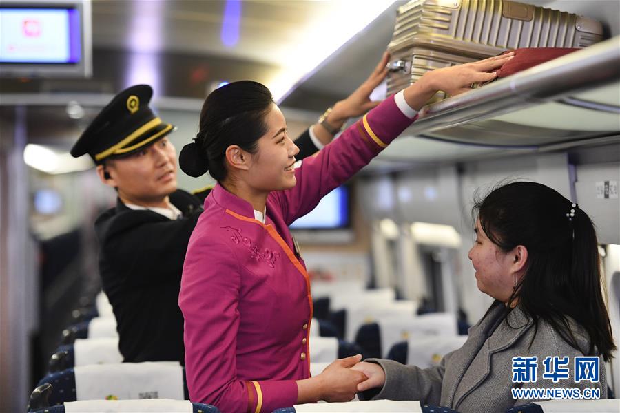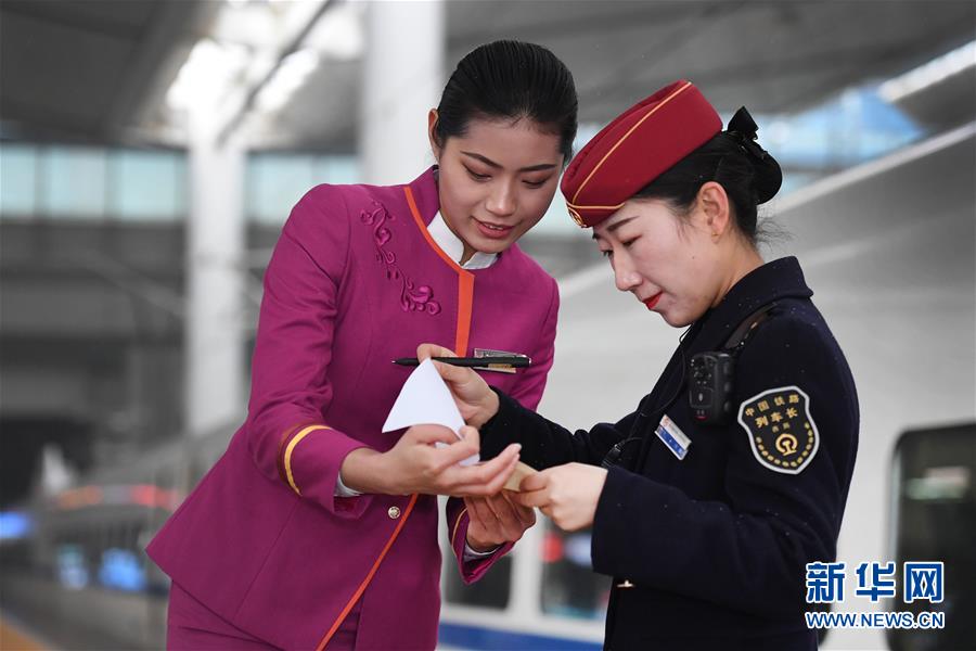 吉如(左)將盲人旅客吳瀟護(hù)送上車后,與列車長進(jìn)行交接(1月15日攝)。新華社記者陶明攝