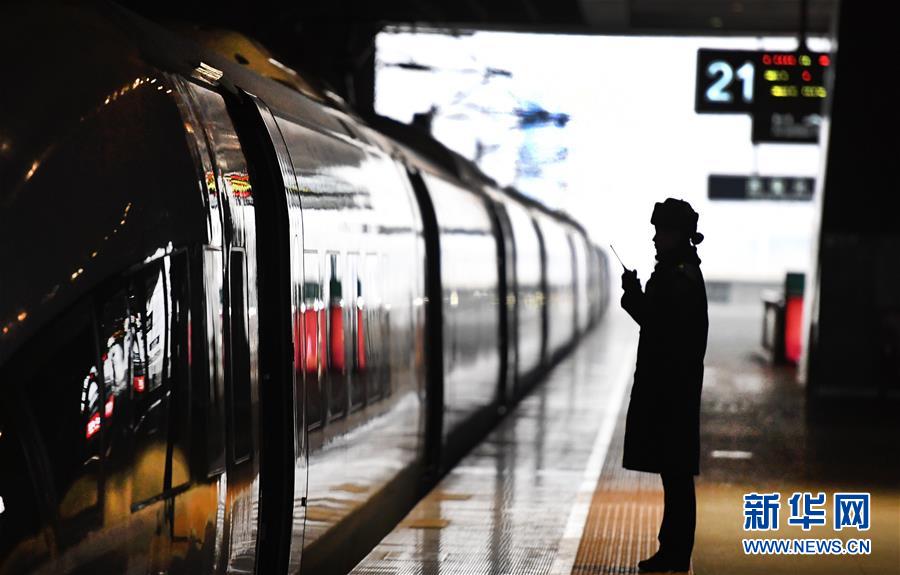 吉如在西安北站站臺上,與檢票口客運(yùn)人員聯(lián)控(1月14日攝)。今年春運(yùn)列車開行密度大,站臺崗位人員緊張,吉如時(shí)常被調(diào)到站臺進(jìn)行站臺服務(wù)工作。新華社記者陶明攝