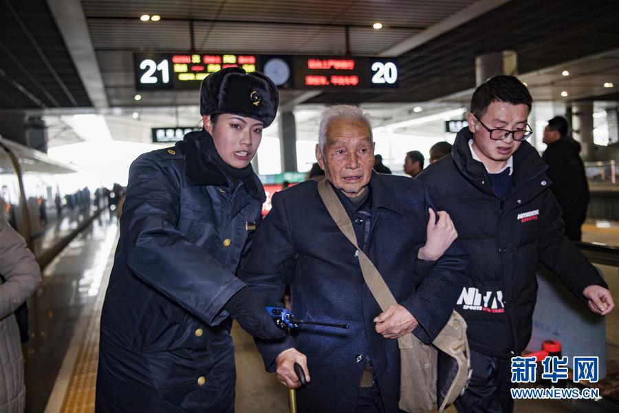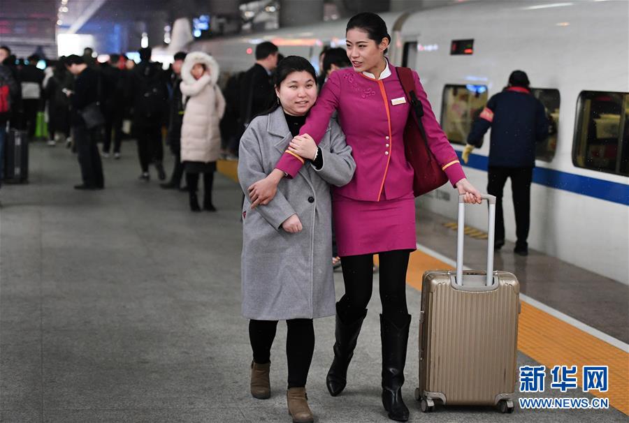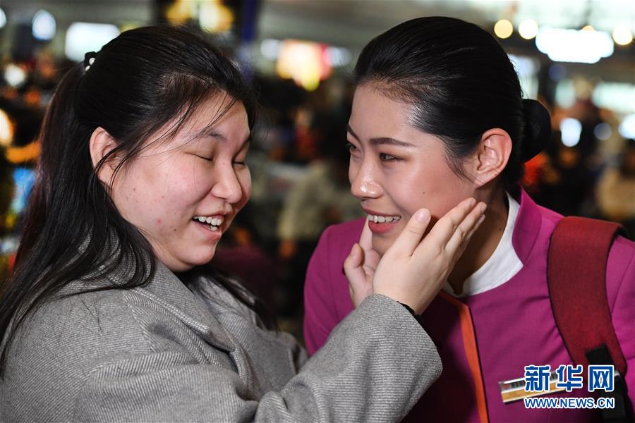 盲人姑娘吳瀟(左)從西安北站中轉(zhuǎn)回延安老家,得到吉如的溫馨服務(wù)。臨別時(shí),吳瀟激動(dòng)地說:“小姐姐,你的服務(wù)太貼心了,我看不見你,能摸摸你的臉頰嗎?”(1月15日攝)。新華社記者陶明攝
