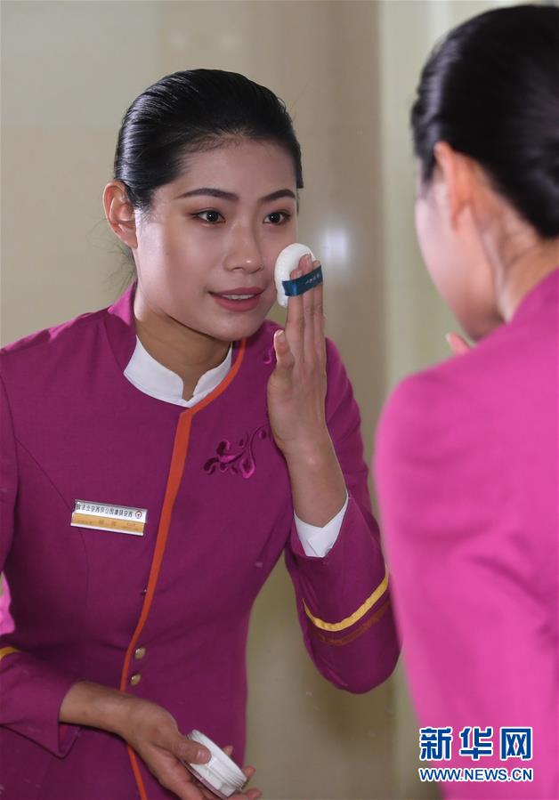 吉如在鏡子前化妝,帶著滿滿的笑意開啟一天的工作(1月15日攝)。新華社記者陶明攝