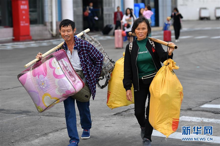 1月19日,來自湖南的務工人員在??谛阌⒏圯喍纱a頭登船返鄉(xiāng)。 新華社記者 郭程 攝
