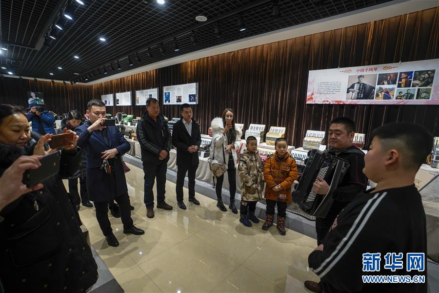 在塔城市手風琴博物館,當?shù)匚乃噽酆谜邽橛慰脱葑嗍诛L琴(1月21日攝)。新華社記者 趙戈 攝