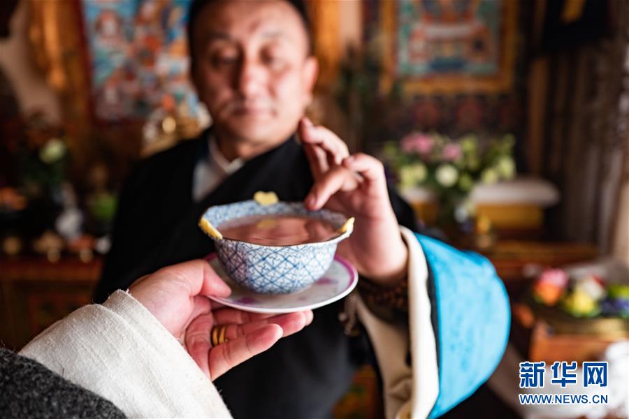 一名拉薩市民在進行品嘗青稞酒前的儀式(2月24日攝)。  新華社記者 普布扎西 攝