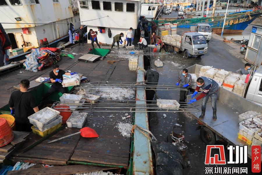2020年2月24日,浙江舟山國際水產城碼頭,當?shù)氐墓と苏趧偪堪兜臐O船上卸魚貨,現(xiàn)場十分繁忙。