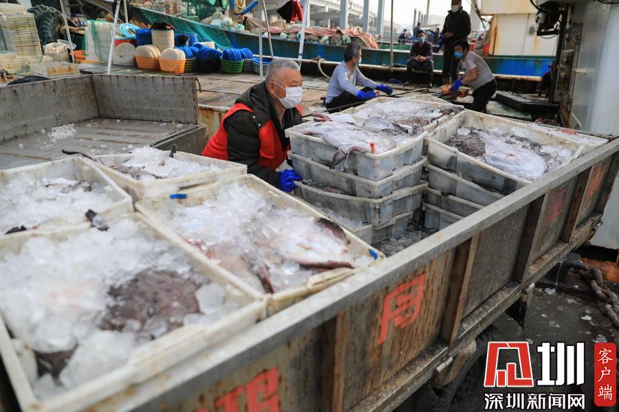 2020年2月24日,浙江舟山國際水產(chǎn)城碼頭,當?shù)氐墓と苏趧偪堪兜臐O船上卸魚貨,現(xiàn)場十分繁忙。