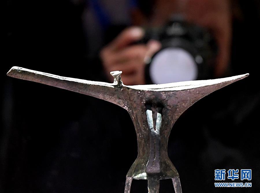 參觀者在二里頭夏都遺址博物館拍攝展品“乳釘紋銅爵”(2019年10月19日攝)。新華社記者李安攝