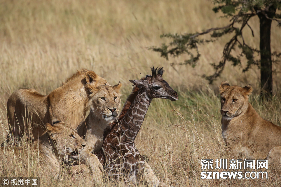 當?shù)貢r間2018年8月15日,肯尼亞馬賽馬拉,當?shù)貙в握材匪埂ぜ{帕索(James Nampaso)拍攝到一群獅子圍攻母長頸鹿和她的幼崽。盡管長頸鹿勇敢地抵抗獅群的進攻,但當一頭母獅跳上它的脊背時,它被分散了注意力,使得獅群最終捕獲了它的孩子。