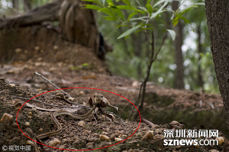 2018年7月18日,廣東東莞,藍綠鵲與蛇的地盤爭斗。